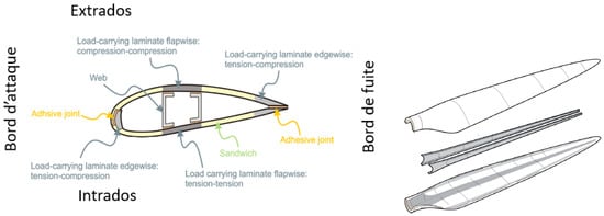 A wind turbine blade is made of two parts, the lower and upper surface, which are connected and stiffened with one or more shear webs that connect the upper and lower parts of the blade shell [15], as shown in Figure 2. This figure illustrates the cross-section of a WTB: the leading edge, the trailing edge, and the lower and upper surface.
