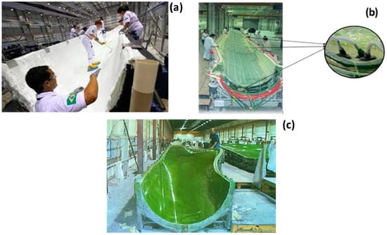 Wind turbine blades are manufactured with composites using a process that is still very manual, leading to different types of defects. Hence, non-destructive testing is required to provide information on the surface and sub-surface of the blade while demonstrating the ability to inspect the blade from the surface [18]. Early types of WTBs were manufactured by wet hand lay-up technology (Figure 3a). Fiberglass was impregnated with rollers and brushes. After being joined by adhesive, the shells are connected to the stringers. The cloths for the larger blades are sandwiched using the same approach but with a higher plies’ fiber content. As shown in Figure 3b, product quality improved with vacuum infusion and the prepreg approach. The prepreg technology was developed by aerospace productions, using impregnated composite fibers. Resin infusion technology was adopted for large turbine blades by positioning the fibers in a closed mold; then, the resin is pumped into the mold. Heat is also applied for curing as soon as the resin settles on the fibers. This technique can be classified as resin transfer molding and vacuum-assisted transfer molding (Figure 3c) [19].