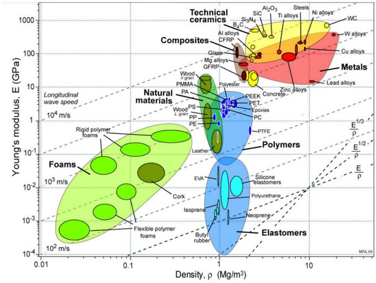 Various materials are used to manufacture WTBs, but the applicability of these materials depends on their weight and stiffness. As shown in Figure 4, composite fibers have adequate strength and stiffness. Despite their high strength and stiffness, composites are lightweight in essence. The fiber orientation in a laminate governs the characteristic behavior of the composite. Therefore, composite materials are usually the preferred choice of material for the manufacturing of WTBs [19]. Furthermore, experimental studies demonstrate that a low temperature increases the stiffness and compressive strength of CF/CPTSP. Conversely, higher temperatures may cause diminishing mechanical properties in composites [20].