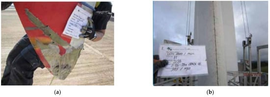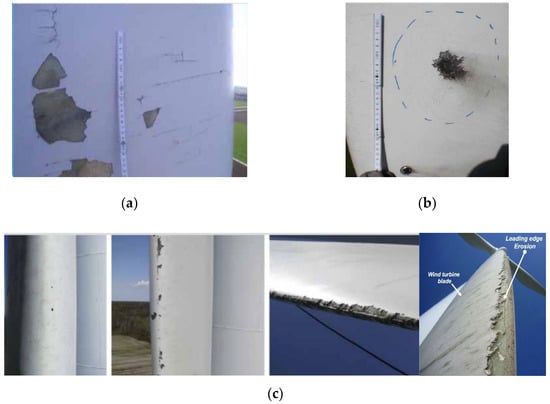 The defects encountered on a wind turbine blade can originate from the design, manufacturing, handling, operation, or repair. A defect might also have been created for multiple other reasons [21,22,23]. Poor design, i.e., underestimation of loads and poor defect characterization, can lead to damage during operation or handling (during transport of the blade). The manufacturing process of WTBs is not very automated and, despite the rigor applied in the quality control, some defects on the blades can escape the intiail inspections in a factory. In this case, a dry fiber or a ratio rich in fiber can lead to local delamination. While handling the blades either during transportation (often over long distances) or during installation by crane, the blades can be subjected to shocks or compressions, causing scratches, and chipping (on the leading or trailing edge). Once in operation, the blade is subjected to multiple potential causes of wear or failure, including leading edge erosion, lightning strikes, frost, particles from agricultural land, ultraviolet radiation, salt air, birds, and insects. Poorly executed repairs can lead to new defects or more severe damage.
