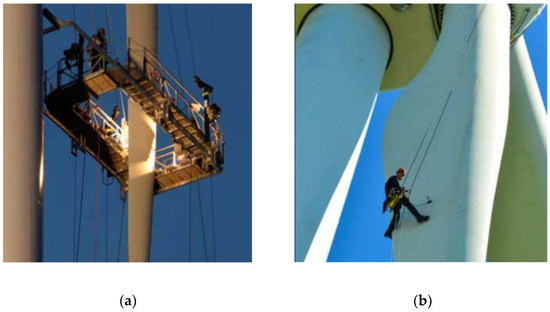 Visual inspection by a rope or platform worker (Figure 9) is very time-consuming (requires several hours of inspection for each blade and the turbine is shut down the entire time); it is possible to repair the defect on-site, but it is expensive. Visual inspection from the ground is also very time-consuming. Visual inspection from a drone is very fast and safe for the worker. Although the various manual inspection methods that have been used to date are able to detect and characterize several defect categories on a blade, they remain time-consuming and expensive. Some of these methods, such as rope inspection, pose safety risks for workers. However, the use of remote inspection methods using drones, which are more flexible, faster, more economical, and safer, can limit the number of defects detected by inspection or affect their classification. Despite these constraints, drone inspection has undeniable advantages. Studies conducted with different industrial stakeholders have shown that the use of remote-inspection methods using drones has indeed the advantage of providing a quick and cost-effective idea of the number of defects and their distribution for a wind farm. Although the use of drones does not have the same accuracy, all agree that it allows for the inspection of a greater number of blades at the same time, limiting direct interventions to only those needed for repairs. In this respect, the use of drones could revolutionize field inspection.