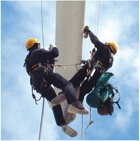 Figure 9. Visual inspection by rope [36]. - Visual inspections from the ground with binoculars or telescope;