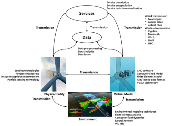 Since massive multisource heterogeneous data are generated during the operation of a wind turbine, big data analytics technologies are required to collect, transmit, store and process the data. DT services cope with the concrete functions depending on the operation of the wind turbine. Extensive sensor technology is installed on the wind turbines to control and monitor their operation. In offshore wind farms, several hundred sensors continuously provide data on temperatures, pressures, speeds, accelerations, forces, voltages, environmental conditions, and other physical data. The issue of real-time data-processing and dealing with a large amount of available data may arise for digital twins of wind turbines. The adoption of IoT offers the significant benefits of DT—the ability for devices to communicate across a common platform. As connected machines can capture and document significant amounts of data, this allows for the opportunity to perform deep analyses across multiple devices. Issues and trends can be quickly identified and managed in a much more meaningful and efficient manner. Digital twins of wind turbines can not only follow the current condition, but also predict the future of their physical counterparts and play an increasingly significant role in proactive maintenance and prediction [54]. In such a model, the simulated data obtained from numerical modeling and the sensor data acquired from the wind turbine are continuously monitored, collected, and processed in real-time to adapt to operational situations [55,56,57]. The processed data from all these resources can be converted into the most effective and suitable operation-management and energy-production instructions.