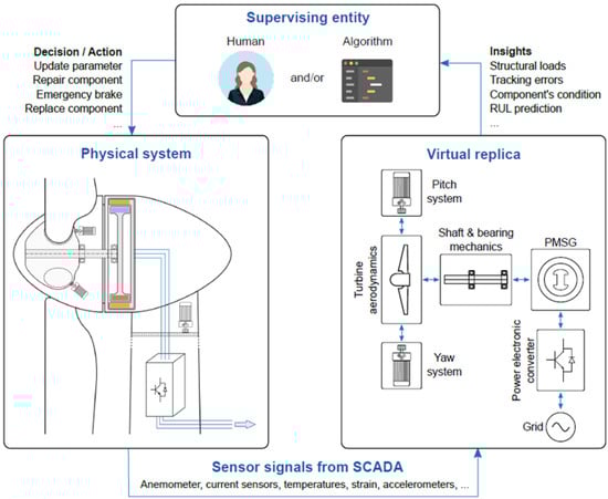 Digital twin schematic of a wind turbine, including the physical system (left), its virtual replica (right) and the supervising entity (top) [60].