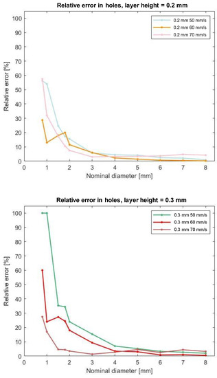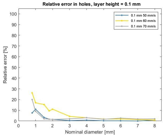 However, an unexpected result has been derived by comparing the relative error using the same layer height and varying the printing speed. Figure 6 shows how for a small value of the nominal diameter, the relative error will be small for the combinations of parameters (printing speed = 50 mm/s, layer height = 0.1 mm); (printing speed = 60 mm/s, layer height = 0.2 mm); and (printing speed = 70 mm/s, layer height = 0.3 mm). This can be explained by the fact that the amount of extruded material (which depends on the set of layer height set) must be in accordance with the speed at which it is placed on the piece.