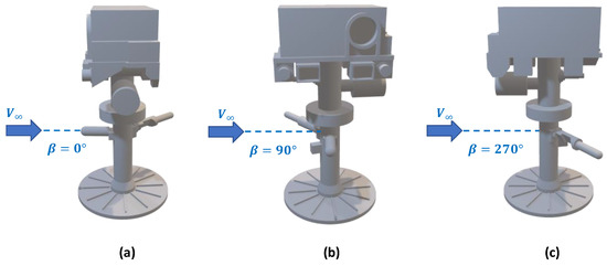 As evidenced in [16], the test was carried out at slip angles of 0°, 90°, 180° and 270°. Since it was not possible to create outlet orifices every 30° (because of the presence of the prisms that hold both anemometers), the only results that can be compared are those with a slip angle of 90° and 270°. We can observe slip angles in three different orientations of the model in Figure 9.