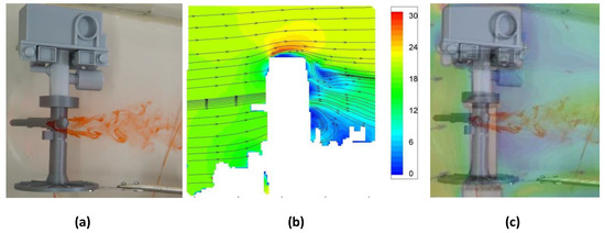 Once again, by reviewing the results obtained in the CFD simulation and in the wind tunnel [16], the first ones are not correlated with the second ones, since the region where the recirculation bubbles predominate is smaller than expected. Due to this, a comparison is performed using the wind tunnel test as a model (Figure 12b). This overlap (Figure 12c), shows that both experiments have the same tendency. Upstream, the streamlines placed near the studied anemometers are contracted, trying to avoid the anemometer curving them up. If the towing tank experiment is observed, it is possible to detect that the red mixture follows the same path as the streamlines on the wind tunnel experiment.