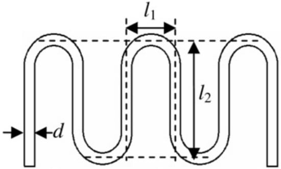 The study was based on a horizontal flow in a serpentine pipe, as presented in Figure 2. The inner diameter of the tube was equal to 6 mm, with a thickness of 1 mm. The lengths identified as and in Figure 2 were equal to 28 mm and 70 mm, respectively, which led to a total unwound length of 504 mm. The tube was made of quartz glass, and coated with a thin layer of an electric conducting metal oxide. The material properties are summarized in Table 1. A voltage difference was applied between two electrodes, which were placed at the inlet and the outlet of the tube. Thereafter, an isotropic heat flux was applied to the external wall, thanks to the Joule effect. The refrigerant R141b was used as heat transfer fluid: its physical properties, which varied with temperature, were extracted from the CoolProp library.