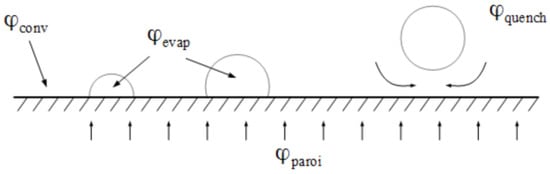 (b) The Kurul and Podowski model [] is adopted in these simulations, which decomposes the incoming parietal flux into three contributions: a convective flux (), unaffected by the presence of bubbles; a quenching flux (), induced by the cold water brought when bubbles leave the wall; and an evaporation flux, to generate vapor () (see Figure 3).