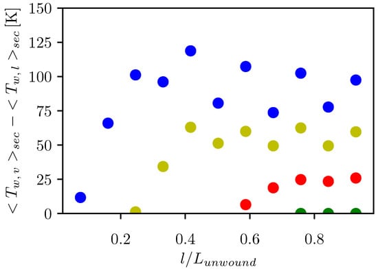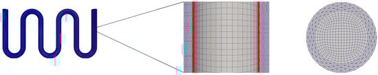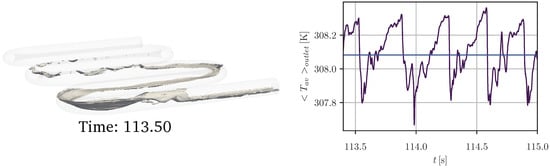 Simulations with conjugated heat transfer were performed with NEPTUNE_CFD software coupled with SYRTHES software, in order to solve 3-dimension conduction in the tube. The surface where the coupling occurred is represented in red on Figure 4. At each time step, the temperature computed by SYRTHES was given to NEPTUNE_CFD for all meshes at the interface between fluid and solid. The pipe thickness was divided into five meshes for all the simulations performed, and the influence of the flow domain resolution on the results was assessed (see Section 3.1). The flow was assumed to be incompressible in each phase. At the interface, the velocity jump was described by the right-hand term of Equation (2). A priori tests have shown that the consideration of a turbulence model has no significant influence on the results; therefore, for the sake of numerical cost, the simulations presented in this study were obtained without any turbulence model in the flow core. Heat losses by natural convection were considered on the external surface of the serpentine pipe, considering an ambient temperature of : we estimated the latter, as the authors did not provide this information in their paper. The convective heat transfer coefficient was estimated by the correlation of Churchill and Chu [].