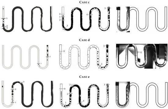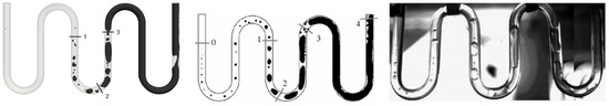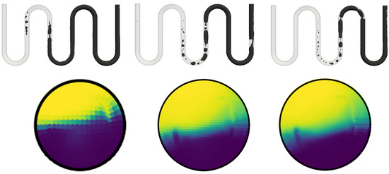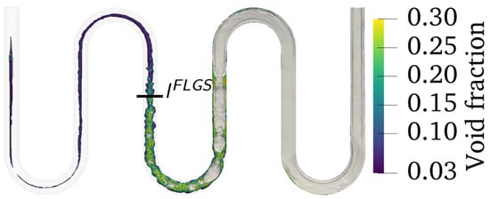 In this figure, one can observe that our approach was in satisfactory accordance with the results presented by []; however, in our simulations, the first bubbles appeared at the beginning of the third straight tube, whereas in the Yang simulation and experience, the first bubbles appeared right after the inlet. This difference could be explained by several factors. Firstly, our visualization only represented the isocontour , which produced the large interfaces in our modeling approach. In other words, the subgrid gas content was not represented in Figure 7: to make it appear, a second visualization of the flow regime was proposed, as shown in Figure 8, where the subgrid gas content has been added, using a color scale. In this figure, one can observe that the dispersed gas phase was created close to the inlet, due to the wall heat flux. Another reason that might explain the discrepancies was directly linked to the specification of the wall boundary condition itself. In our simulations, free convection with the ambient was considered: to do so, a convective heat transfer of was estimated, by means of the correlation of Churchill and Chu []. This value was consistent with the wall-ambient temperature differences involved in this calculation case; furthermore, the author did not specify the ambient temperature in the experiment room. Finally, an experimental issue, involving the injection of air bubbles at the inlet, was also possible.