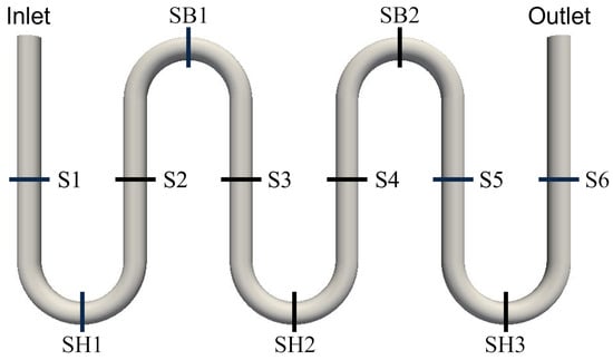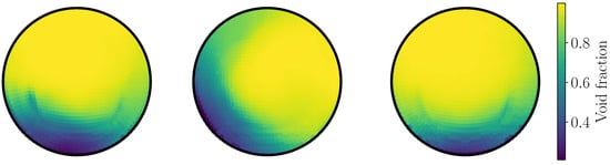 The mean and RMS fields of the void fraction in section S6 are represented in Figure 9. For the mean field, the void fraction evolved from 0 (liquid phase) to 1 (vapor sky). On a wide band around the interface, the void fraction comprised between 0 and 1, which could be explained by a numerical diffusion of the interface, mesh influence and also the effect of passing waves; furthermore, above the interface and on both sides of the tube, the void fraction evolved from to , which was due to the presence of droplets in the vapor sky. The RMS field supported the presence of droplets, as it was not strictly equal to 0 in the vapor sky; however, droplets were only passively transported in the present version of the code. Future work should take advantage of the droplet momentum transfer closure proposed by Davy et al. [,]. High RMS fields were located in the vicinity of the interface, which confirmed the presence of waves in the flow: the asymmetric character of these fields could be explained by the influence of the last elbow, which implied a high asymmetric flow with respect to the vertical axis.