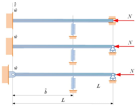 We shall consider three heterogeneous beams of length L with uniform cross-section shown in Figure 1. The axial force N () is compressive. The first beam is a fixed-fixed beam with an intermediate spring support (FssF beam), the second is a fixed-pinned beam also with an intermediate support (FssP beam) and the third is a pinned-pinned beam which also has an intermediate spring support (PssP beam). If the intermediate support is a roller the beams are referred to as FrF, FrP and PrP beams. The E-weighted centerline (called centerline for brevity) of each beam coincides with axis of the coordinate system . Note that the E-weighted first moment is zero in this coordinate system [,]: