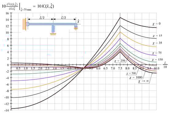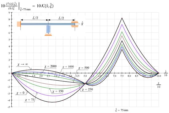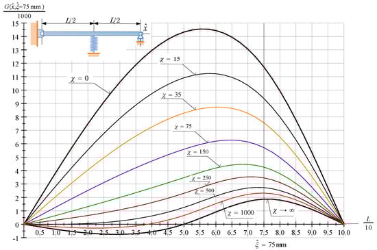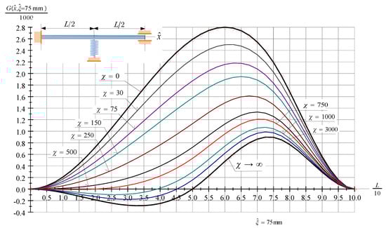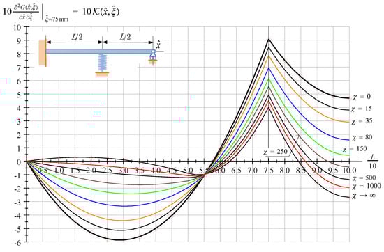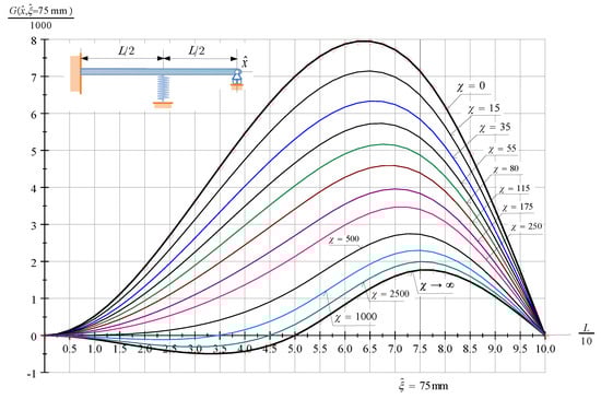 Figure 2 depicts the Green function of an FssF beam provided that mm, mm while the dimensionless spring constant is a parameter. If () [] the beam behaves as if it were (a fixed-fixed beam) [an FrF beam]. The curves that show the Green function for these cases are drawn with thick black lines. The red diamonds and crosses depict the computed values. It is also worthy of mentioning that the Green function is the dimensionless vertical displacement of the material points on the centerline due to a dimensionless and positive unit force applied to the beam at the point on the centerline with coordinate .