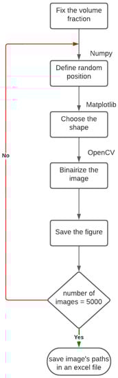 This step consists of collecting the input data, also called Features, which represent in our model the microstructures. In previous studies, the generation of microstructures is always done using Digimat Software, which is software used to generate a Representative Volume Element (RVE) of the great variety of material microstructures. One of the disadvantages of this platform is that it is able to generate only one microstructure per test. In our case, this software would be useless because we needed to run the finite element calculation on a database that contains thousands of 2D images. In order to automate this step, we have developed a python script based on the use of the library Matplotlib and Open CV, capable of generating a huge number of microstructures with different shapes and volume fractions. The algorithm is organized as shown in Figure 1