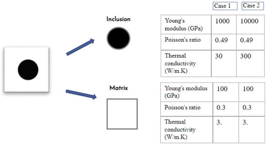 As discussed before, the heterogeneous material used is composed of a matrix and a single inclusion as shown in Figure 2. The value of the volume fraction is modified during the first phase (generation of microstructure), while the value of contrast must be edited in the calculation files before starting the simulations by modifying the value of Young’s modulus as well as the thermal conductivity.