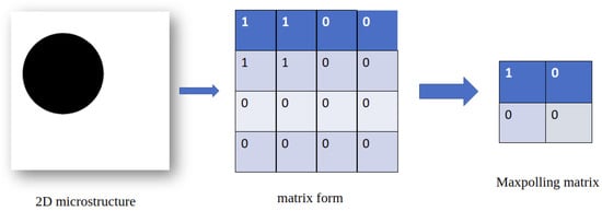 In recent years, a number of experimental studies have been done in order to predict the mechanical and thermal behavior of heterogeneous materials. Mentges and Dashtbozorg [] developed an Artificial Neural Network (ANN) model able to predict the elastic proprieties of short fiber composite. The data set is created using finite element calculation and orientation averaging, where the input represents the microstructural parameters (Young modulus of fiber, Young modulus of the matrix, volume fraction, the orientation of fiber, etc.), and the output is the Young modulus resulting from experimental homogenization approach. Li and Zhuang [] also intend to model the multi-scale constitution using a Feed-forward Neural Network (FNN) and a Recurrent Neural Network (RNN), which represent a specific approach for Deep Learning technology. The data base is obtained via the implementation of offline multiscale computation based on finite element calculations. Another model was developed by Emily and Kailasnath [] in order to forecast the mechanical properties of a family of two phases of materials using their microstructure image as input and the elastic modulus as output. The purpose of this work is to train and test the data set through various machine learning algorithms like Random Forest (RF), Extra Trees Forest (ETF), Gradient Boosted Trees (GBT), etc. Liang and Gan [] provide an alternative for predicting the creep modulus of cement paste using a Deep Convolutional Neural Network (DCNN) that can learn from a database containing 18,920 microstructures and their corresponding creep modulus using an experimentally validated microscale lattice model for short-term creep. Zhenya and Zhenkun [] proposed an engineering approach that deals with the development of an analytical and computationally efficient tool using an artificial neural network for predicting the bulking and ultimate loads of composite hat-stiffened panels under in-plane shear. The data set has been collected by combining the FE method and the experimental verification. The characteristic parameters were extracted and compressed using an Auto-Encoder (AE). Thereafter, the back-propagation neural network was trained to predict the bulking and ultimate loads. Allan and Priyank [] demonstrated the applicability of neural networks for modeling the mechanical properties of composites from the stacking pattern of the laminates. The purpose of this work is to predict the eigenvalues of the laminate stiffness matrix as a function of the number of layers and angles of orientation. The closest work to that which we will do in this article is the study of Do-Won and Jae [] that consist of predicting the transverse mechanical behavior of unidirectional composites using a convolutional neural network. The model learns from a database containing 900 representative volume elements by constructing 300 for each volume fraction of the inclusion (40%, 50%, 60%) in order to obtain the stress–strain curve as a result.