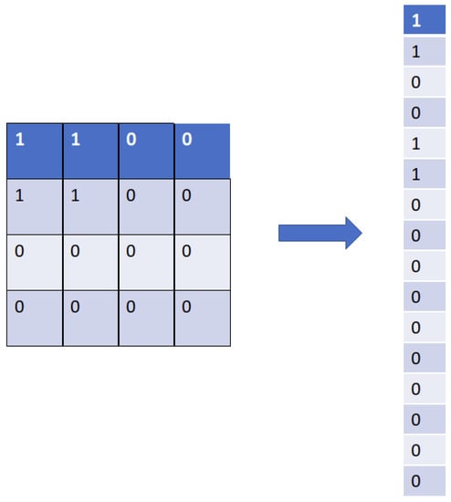 The goal of image processing using neural network technology is to obtain an output label from an input image. For example, in our study, we will give a microstructure as input to obtain the elastic and thermal properties as output, except that the output from the convolution operation, as well as the maxpolling, is a 3 dimensional tensor (height, width, color), which cannot be a final layer. Therefore, we use a layer called Flatten layer which allows the compressing of the tensor to reduce its dimension. It takes as input a 3D tensor and returns a vector. The pixels are recovered line by line and added to the final vector. The example is shown in Figure 8.