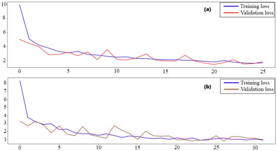 Mean Absolute Percentage Error curves using training and validation data consists in following the evolution of the training according to the number of epochs, (a) presents scenario 4 while (b) presents scenario 6.