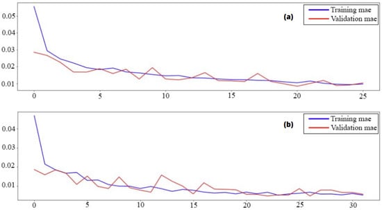 Mean Absolute Error curves using training and validation data consists in following the evolution of the training according to the number of epochs, (a) presents scenario 4 while (b) presents scenario 6.