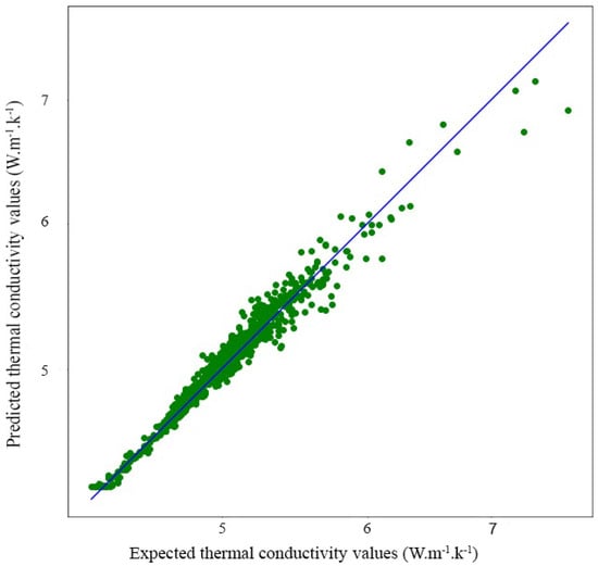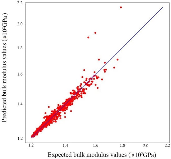 Figure 11, Figure 12 and Figure 13 show the results of predictions of different values of modulus (bulk, shear, thermal conductivity) for the case of scenario 4. We can observe that the linear regression line passes through the maximum of the points. We may conclude that the regression model fits the data reasonably well.