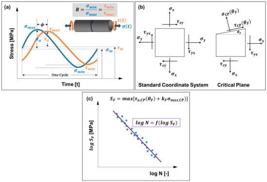 The fatigue loading parameters are graphically represented in Figure 1a considering a phase-shifted multiaxial stress state with shear and tensile stresses.