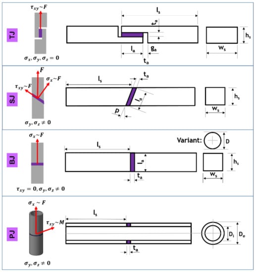 Geometry parameters of adhesively bonded joints and respective load cases: Thick-Adherend-Shear-Test Joint (TJ), Scarf joint (SJ), Butt joint (BJ), and Pipe Joint (PJ).