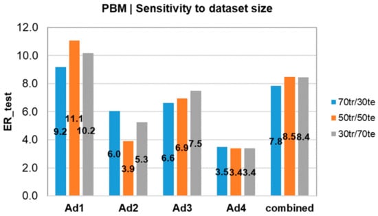 The proportions of each split were kept among each adhesive to ensure an equally distributed (balanced) dataset. A random shuffle of the dataset for each adhesive was carried out. Then, the split was done per each adhesive, which was followed by the combination into a single dataset (train and test set). The different splits, and respective sizes of the train (tr) and test (te) datasets are listed in Table 4.