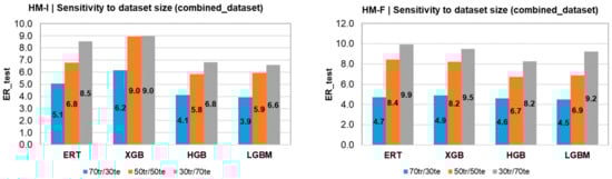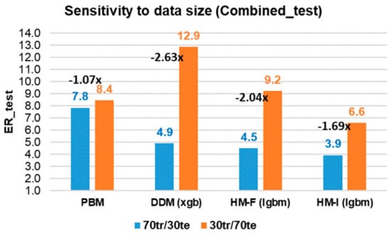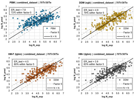 The fatigue dataset consists of 979 fatigue data points from four structural adhesives with four joint configurations taken from heterogeneous data sources. To assess the sensitivity to data size, the fatigue dataset is split with three different ratios of the train/test dataset, namely 70%/30%, 50%/50%, and 30%/70%. Prediction accuracy is evaluated by the R2, as well as the error factor (ER) for lifetime predictions of the train and test datasets.