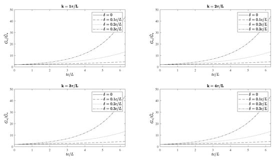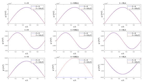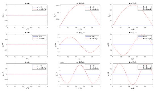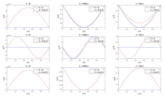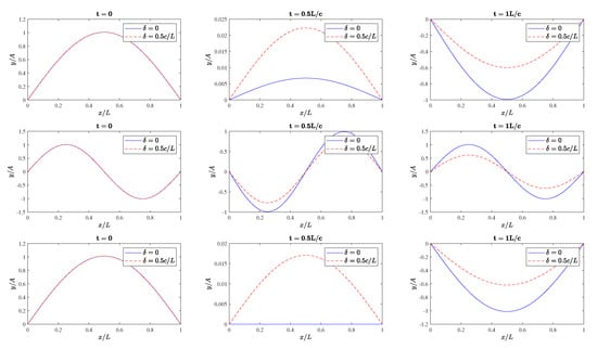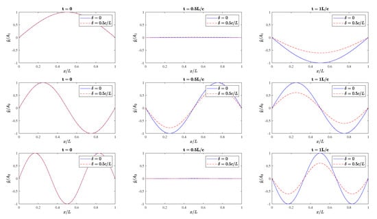 Figure 2 shows the dimensionless amplitudes, , of the forced oscillations at three distinct times: . All the oscillations shown in the figure result from Equation (37). The blue solid lines correspond to oscillations without damping, , whereas the red dashed lines are for oscillations with damping, . Figure 2 shows three distinct situations regarding the values of the mode of oscillation n (or as a consequence in the wavenumber ) and forced frequency. The upper plots are obtained for , the plots at the middle row are for and the bottom plots correspond to . In all the three cases, means that the oscillations are not resonant.