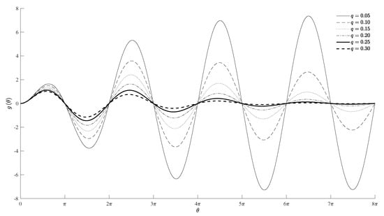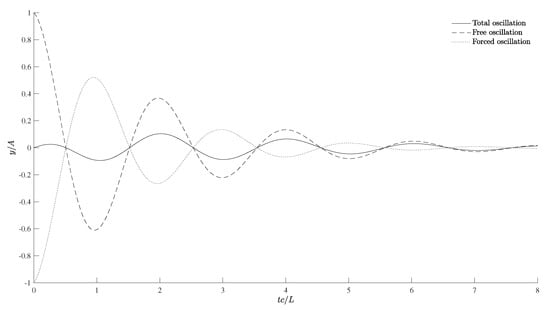 The values of the mode of oscillation and forced frequency influence the amplitude and phase of the oscillation. The presence of damping attenuates the amplitude of oscillations. Indeed, Equation (32a) shows that when the value of damping increases, the amplitude factor E is greater and consequently the amplitude of oscillation decreases. The other effect of damping that can be visualized in Figure 2 is that it delays the stage of oscillation. This property can be confirmed by Equation (32b) with the existence of damping . As opposed to the free oscillations, the maximum and minimum amplitudes of the forced oscillations remain constant over time. The amplitude of the oscillation does not depend on time.