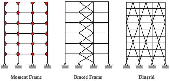 Diagrid structures made of steel are effective in providing strength and support for massive structures. For instance, the popular diagrid buildings around the globe include the Jinling Tower of China, the Cyclone Tower in Asia, the Capital Gate Tower in Abu Dhabi, United Arab Emirates, the Hearst Tower in New York, NY, USA and the Swiss Re in London, UK [14]. Moment frame systems, also called rigid frame systems, consist of beams and columns used to reinforce concrete and steel structures. Hence, the since moment frames are more flexible than shear walls and braced frames as showing in the Figure 1 [15]. In the past, the diagrid system, reinforced steel, and concrete members were used in the construction of tall buildings [16]. On the other hand, braced structures are reinforced by steel to increase the strength of the building. The steel diagrid system is one of the best structural systems for constructing tall buildings that are irregularly shaped. Moreover, the benefits associated with diagrid systems in the construction of structures include the improvement of the aesthetic view of the building, the minimizing of the use of steel by up to 20% as compared to other systems, the use of a simple construction technology instead of highly skilled labor, and the elimination of the need to have a structure with corner columns; the overall structure requires less space if designed correctly, and the materials weigh less while providing maximum strength [17]. In addition, the complexities associated with steel members include the size of the structure or the shape of the structure, which may require the use of certified pre-fabricated steel connections, which can lead to an increase in construction costs. Currently, there are limited experienced crews available to install diagrid structures because the system requires skilled professionals who can handle this type of structure. Braced structures have several advantages in that they are economical, easy to erect, and occupy less space. Moreover, these structures can resist seismic forces as well as offer flexibility in terms of strength and stiffness [18]. Furthermore, moment frames need less work and less details, but at the same time, they have an increase in lateral displacements in cases of natural catastrophes such as earthquakes. Several researchers mentioned that the most basic structures that are used to resist both lateral and vertical loads are moment-resisting frames [19,20,21,22]. Moreover, the combination of the moment frame with non-structural element such as masonry increases the performance of the frames; for example, the Hotel San Diego (New York, NY, USA) is a six-story reinforced concrete infilled-frame structure that resists loads [23]. In 2007, Karavasilis found that braced frames have the extra vertical steel trusses that are very efficient in resisting lateral loads [24]. On the other hand, the bracing is a very effective global upgrading strategy as it enhances the global stiffness and strength of steel and composite frames [25]. The positioning of braces, however, can be problematic as they can interfere with the design of the façade and the position of openings. Braces can be aesthetically unpleasant where they change the original architectural features of the building [26,27].