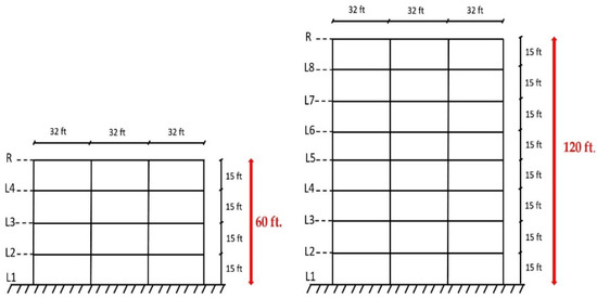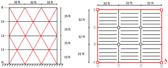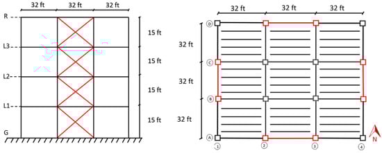 The structural dimensions were considered to be four-story and eight-story buildings with a floor-to-floor height of 15 ft., and three bays of 32 ft. × 32 ft. in each direction. The space between the columns was 32 ft. The maximum building height was 120 ft. for the eight-story building and 60 ft. for the four-story building. The following Figure 3, Figure 4 and Figure 5 show a typical floor plan and elevation for the models. The elements shown in red are the main lateral resisting members analyzed during this study. The RAM structural system is advanced software used for analyzing both multi-story buildings and high-rise structures. Hence, it was developed by Bentley Systems, Inc. (Exton, PA, USA) and is used by many engineers and architects. The software is designed to be used in the early stages of a project to analyze and design the structure and then to monitor the progress of the project throughout the construction process. The software has powerful features that allow users to quickly evaluate and analyze existing building structures, as well as to design new structures [33]. The models have been used for the analysis of shear, drift, and displacement results. Hence, the seismic and wind analysis parameters are also examined as the buildings located in the Omaha, NE, USA are considered for the proposed data. The load combination taken for the wind and seismic parameters is derived from the ASCE 7–10 [34].