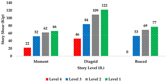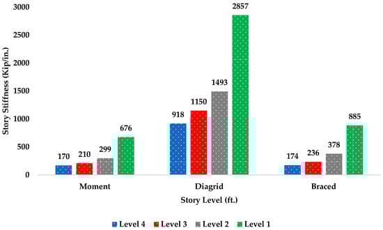 The inclined columns in the diagrid system helped in resisting any axial action imposed on the building. The analysis of story stiffness for the diagrid system represented in Figure 9 shows how stiff the system was as compared to the braced and moment frames, where the fourth story needed a force of 918 to push the story one inch, which was four times more force than the moment frame needed for the top story. In conclusion, the moment frame is the weakest frame compared to the other two, followed by the braced frame, and then the diagrid system.