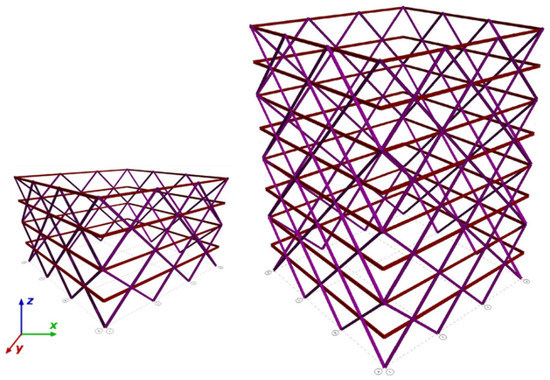 During the late 19th and early 20th centuries, engineering development created thin shell and tensile structures of extraordinary refinement and elegance, using the diagrid system with various types, such as the metal, concrete, or wooden beams that are used in the construction of buildings [1]. However, their studies were based on the elastic and plastic behavior of simple rectangular uniform diagonal grids, and the studies tried to find formulas for their collapse loads [2,3]. Due to the rapidly growing population and the scarcity of urban land, the last few decades have required architectures that must consider ways of enabling vertical growth. Structural safety has always been a key preoccupation and responsibility in the design of civil engineering projects [4]. Steel framing systems typically refer to a building technique such as vertical steel columns and horizontal I-beams. However, the framing system used in a building works by transferring all building loads to the foundation to give firmness and strength to the building [5,6,7]. In response, the use of a diagrid structural system has become widespread because of its aesthetic potential combined with its structural efficiency [6]. Nowadays, the growth of the diagrid structural system in both the industrial private sectors and the public sectors during the past decade is of interest to numerous researchers looking for the guidelines for the optimum structural system for multi-story buildings in terms of saving time and the cost of the construction [7]. The framing systems that are used in a building work by transferring all the building loads to the foundation to provide firmness and strength to the building [8]. The framing system is also critical to the building’s loading path, leading to an appropriately designed and erected framing system [9]. Framing systems can be found in load-bearing walls, beams, girders and other elements of the structure. Steel moment, braced, and diagrid frames offer the strength that aids in lateral load resistance. Furthermore, these structures are known for their strength, durability, and cost-effectiveness. These structures are typically constructed with steel frames and modular components, such as walls, floors, and roofs, which are designed to fit together like a giant puzzle [10]. Therefore, the modules are then connected together with bolts and welds to form a structural unit. This construction method allows for a faster assembly process and a more efficient use of materials compared to the traditional construction methods. Additionally, these structures are often designed with fire-resistant elements, which can help to reduce insurance and/or construction costs. In recent years, diagrid systems have been used in the construction of multi-story buildings, including the world’s tallest building, the Burj Khalifa in Dubai, (United Arab Emirates). Other examples of diagrid buildings include the Shanghai Tower (Shanghai, China), the Trump International Hotel and Tower in Chicago (IL, USA), and the Empire State Building in New York City (NY, USA) [11,12]. Diagrid systems have also been used in the construction of sports stadiums, such as the Mercedes-Benz Stadium in Atlanta (GA, USA) [13].
