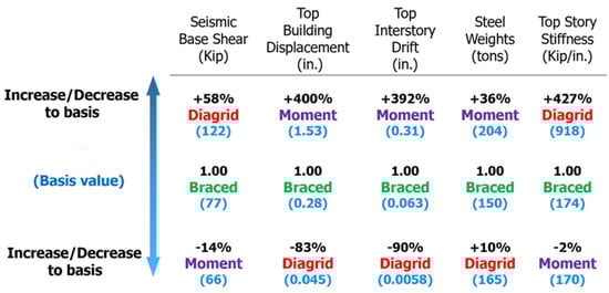 Building displacement of moment, diagrid, and braced frame.