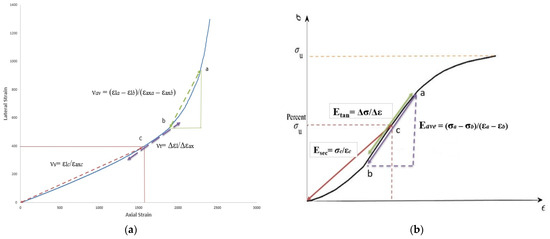 The origin of the secant Poisson’s ratio was maintained at the zero-stress position, but the reference point was considered a moving point that changes with stress in order to analyze the behavior of the secant Poisson’s ratio. The secant Young’s modulus (Es) is defined as the slope of the line from the origin to some fixed percentage of ultimate strength. The average Poisson’s ratio reflects the relative change in axial and radial strain at the upper and lower limits of some stress interval. The average Young’s modulus (Eav) of the straight-line part of a curve is defined as the slope of the straight-line part of the stress–strain curve for the given test. The axial strain-lateral strain curve’s tangential slope is represented by the tangent Poisson’s ratio. The tangent Poisson’s ratio calculation is more susceptible to changes in the testing procedure and sample frequency than the secant Poisson’s ratio calculation. The tangent Young’s modulus (Et) is defined as the slope of a line tangent to the stress–strain curve at a fixed percentage of ultimate strength.