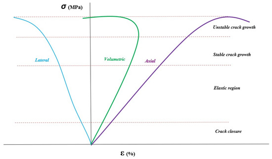 A common stress–strain diagram for rock showing axial, transverse, and volumetric deformation [13].