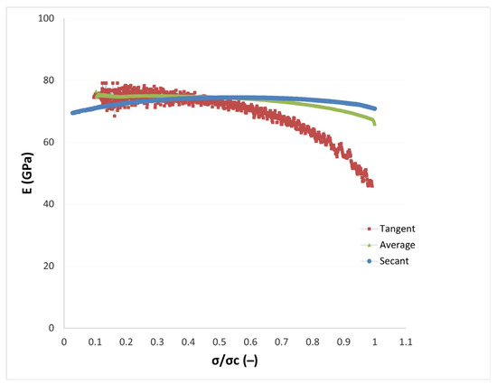 To be more specific, based on Figure 3, the behavior of the secant and average Young’s modulus from crack closure to the failure phase is approximately similar to each other. However, the tangent Young’s modulus shows different behavior. In other words, starting from crack closure through 60% of σ/σc, it demonstrates a similar trend to the secant and average Young’s modulus; after that and until the failure stage, it shows a significant divergence and decreases as the σ/σc increases.