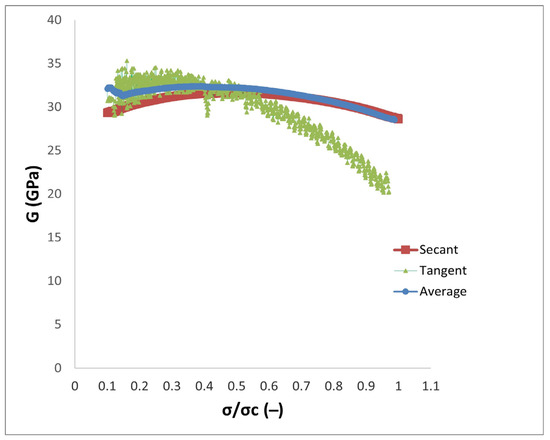 In terms of the rigidity modulus of intact rock, the role of the Poisson’s ratio can be more significant. As indicated in Figure 4, the data is more widely scattering from crack closure through 50% of σ/σc. Similar to the Young’s modulus curves, the behavior of the secant and average shear modulus follow the same trend. Nevertheless, in the case of the tangent shear modulus, a big difference can be observed, and a substantial decrease of the tangent shear modulus occurs from 50% of σ/σc until the failure stage. This phenomenon is more probably associated with the variation of the tangent Poisson’s ratio.