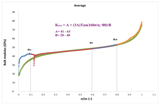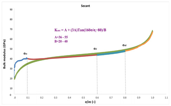 The variations of the bulk modulus for the secant, average, and tangent cases are shown in Figure 5, Figure 6 and Figure 7. In contrast to the secant and average functions, the slope of the bulk modulus variations in the tangent functions is more intense, as illustrated in the figures. The range of crack closure via crack damage stress stages is where the suggested model’s best fit to experimental data is found, in accordance with the data. In addition, between the crack closure and crack damage stages of the loading process, the secant and average bulk modulus develop roughly linearly with stress variations.