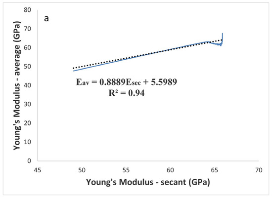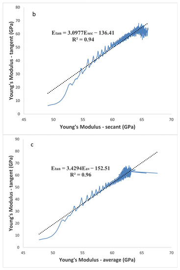 Our research (Figure 8) shows that there have recently been published studies of linear connections between the Young’s modulus constants. Figure 8 illustrates the average Young’s modulus and tangent values, which have an R2 value of 0.96 and are significantly connected linearly. Although both the tangent and average Young’s modulus and the tangent and secant Young’s modulus have R2 values of 0.94, trends can also be traced linearly between these two Young’s moduli. Moreover, according to Figure 8b, the data scattering is denser from 60% of σ/σc through the failure, and it can be related to growing the network of cracks under loading in the uniaxial compressive strength (UCS) test. However, data scattering is less dense from the beginning to 60% of σ/σc, as the crack network is still not widely distributed.
