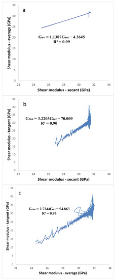 In other words, as a result of the shear modulus-focused analysis shown in Figure 9, the achieved correlations for all situations are also linear with the highest regression coefficient associated with the secant and the average shear modulus with an R2 value of 0.99. Similar to this, there was a strong association between the secant and average shear modulus (R2 = 0.9) and the tangent and average shear modulus (R2 = 0.94) (Figure 9b,c). In addition, Figure 9b,c shows that the data dispersion is more dense from 60% of σ/σc through the failure, which is possibly connected to the expansion of the network of fractures during the uniaxial compressive strength (UCS) test. Due to the fracture network’s lack of widespread distribution, data scattering is less dense from the beginning to 60% of σ/σc.