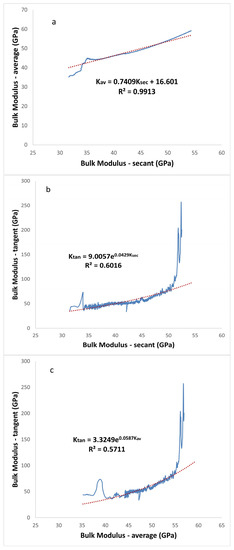 In Figure 10a, the linear relationship between the secant and average bulk modulus is shown. At R2 = 0.99, it exhibits a strong correlation. The correlation is, nevertheless, significantly reduced in Figure 10b,c when we compute the secant and tangent bulk modulus and the average and tangent bulk modulus, respectively. Figure 10b,c shows that there is not a particularly strong correlation between the secant and tangent bulk modulus (R2 = 0.6) or the tangent and average bulk modulus (R2 = 0.57), and that both of these have nonlinear and exponential patterns.