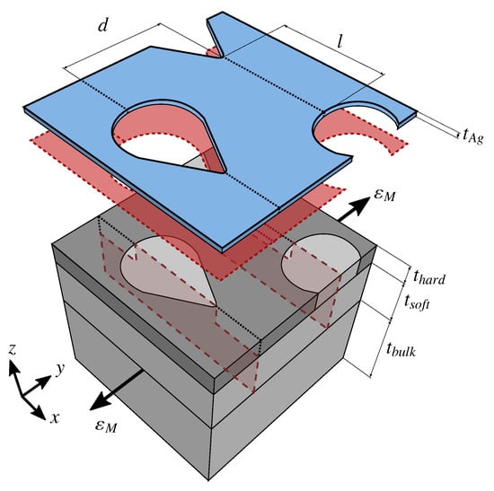 The periodicity of the soft islands pattern (compare Figure A1) allows us to consider a unit cell representative volume element (RVE) [21] as depicted in Figure 1 to simulate a continuous structure. The soft islands structure is composed of a soft PDMS substrate, a hardened PDMS layer with embedded soft islands, and a thin silver film. In the RVE, the soft PDMS substrate is divided into two domains with the same properties for computational purposes: The lower domain () represents the supporting bulk polymer that is not affected by softening or damage effects closer to the structured interface. In the soft PDMS domain () above it, softening and potential cracking may occur under loading. Above the soft material is a layer of UV-hardened PDMS () in which soft islands in a teardrop shape (29 by 20 ) and stable cracks are embedded. The stable cracks continue through the thin silver film (), which covers the hardened surface and has openings above the soft islands. The distance between the soft islands determines the crack length l in x-direction and crack separation d in y-direction. Both can be varied in the composite to tailor the strain behavior [13].
