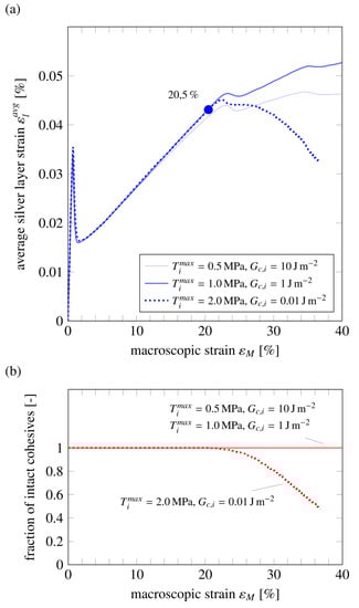 The development of strains in the silver layer and the efficacy of the structure’s strain relief mechanisms before delamination are found to be completely independent of the interface properties (Figure 5a,b, also compare Figure 2). However, the cohesive strength drastically affects the pattern in which delamination propagates (Figure 5c). The reference structure (Section 3.1) has a moderate to high interface strength. With these properties, delamination is only initiated at the back arch of the soft islands and propagates from there, resulting in a characteristic zigzag pattern. For weaker interfaces, secondary delamination at the tips of the islands can be observed. In these cases, two delamination fronts are formed that rapidly propagate toward each other. Due to the low maximum interface traction, delamination is initiated already at applied strains of ca. 10% at the weakest interface, and the cohesive zones fail rapidly. Eventually, the delamination fronts meet between the soft islands with ‘pinched off’ areas of still bonded silver between the cracks that grow smaller as delamination progresses. In these areas, no strain increase in the silver is observed, and the silver remains protected from rupture due to strain relief provided by stable cracks and soft islands.