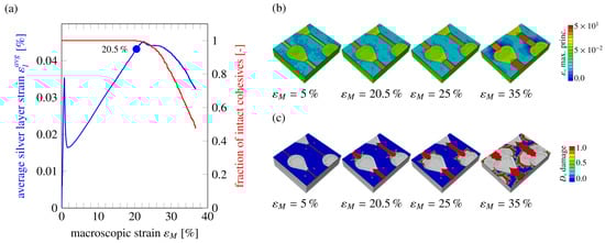 Although the average strains in the thinnest considered silver layer () remain well below % at macroscopic strains of , maximum local strains increase drastically, approaching . Increasing the silver layer thickness by a factor of five results in a sevenfold reduction of maximum strains and a fivefold reduction in average strains in the silver layer (Figure 4b). Extremely thin silver layers, thus, are more likely to fail by rupture of the silver thin film than by delamination.