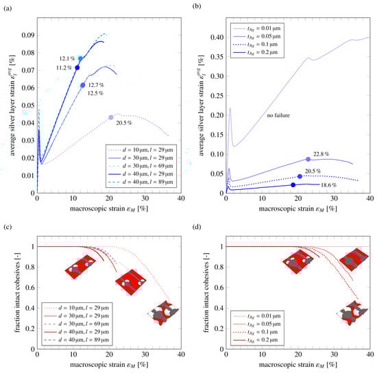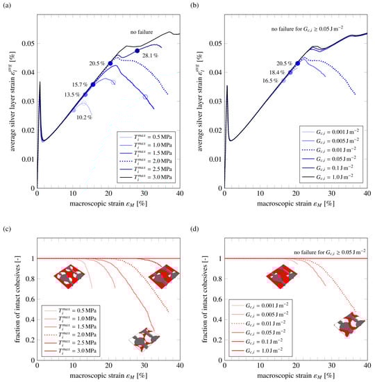 Influence of interface strength (a,c) and interface toughness (b,d) on the average principal strain in the silver layer and fraction of remaining intact interface. Stronger (higher ) and less brittle (higher ) interfaces can both prevent delamination initiation. Strains at delamination initiation are indicated in the plots and marked with dots. Secondary damage initiation is marked by circles. Dotted lines represent the default parameter configuration.
