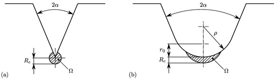 In the case of a sharp notch, the control volume is centred in the notch root and takes the shape of a circle segment. Dealing with blunt notches as a generalized case, the control volume takes the form of a crescent shape with its centre located at a distance from the notch root, where is a function of and [40,42].