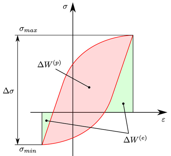 Benedetti et al. [60] summarized different approaches in a visual way, highlighting the absence of a general consensus about the relative importance of the elastic and plastic part in the calculation of the total strain energy density. In order to preserve consistency with the linear–elastic methodology reported in the literature [46,61,62,63], the elastic and plastic contributions and to the total SED are equally considered following Equation (1), where is included regardless of its sign. This approach was also referred to in a preceding study [10]. Figure 2 exemplifies the applied convention, depicting the individual parts of the SED for an illustrative stabilized hysteresis loop.